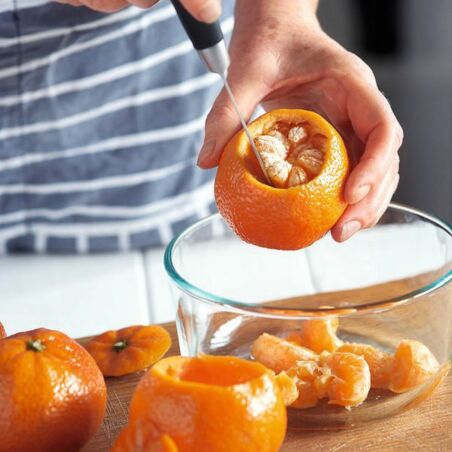 6 schöne Clementinen heiß waschen und abtrocknen. An der Oberseite mit einem scharfen Messer jeweils einen Deckel abschneiden. Das Fruchtfleisch mit der weißen Haut vorsichtig mit einem Messer von der Schale lösen, mit einem Löffel herausschaben und in eine Schüssel geben. Die ausgehöhlten Clementinen und die Deckel in das Tiefkühlfach legen.