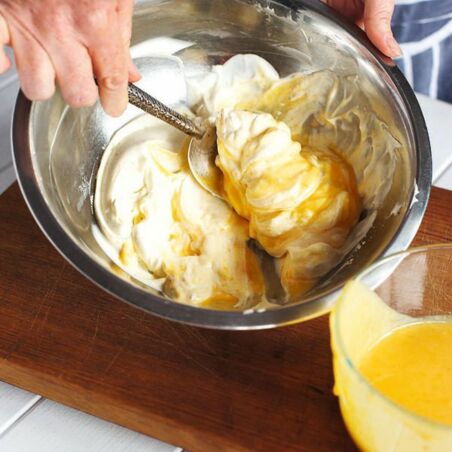 Die Sahne steif schlagen und unter die Clementinenmasse heben. Die Parfaitmasse in die ausgehöhlten Clementinen füllen, die Deckel auflegen und die Parfaits im Tiefkühlfach in ca. 5 Std. gefrieren lassen.