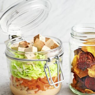 Vom Spitzkohl die äußeren Blätter entfernen, den Kohl ohne Strunk in feinste Streifen hobeln oder schneiden. Die Streifen in einer Schüssel mit 1 TL Salz verkneten, bis der Kohl weich und glänzend wird. Spitzkohl gründlich abbrausen, abtropfen lassen und restliche Flüssigkeit mit einem Küchentuch gut ausdrücken.