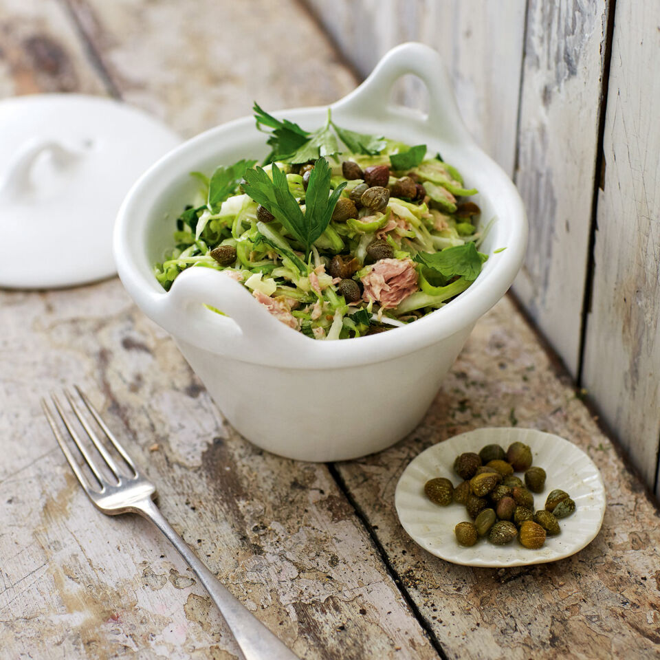 Die Spitzkohlstreifen mit Sellerie, gehackter Petersilie und Frühlingszwiebelstreifen vermengen, dann mit der Thunfisch-Creme mischen. Die Kapern für den Salat abbrausen, trocken tupfen und mit den Petersilienblättchen über den Coleslaw streuen.