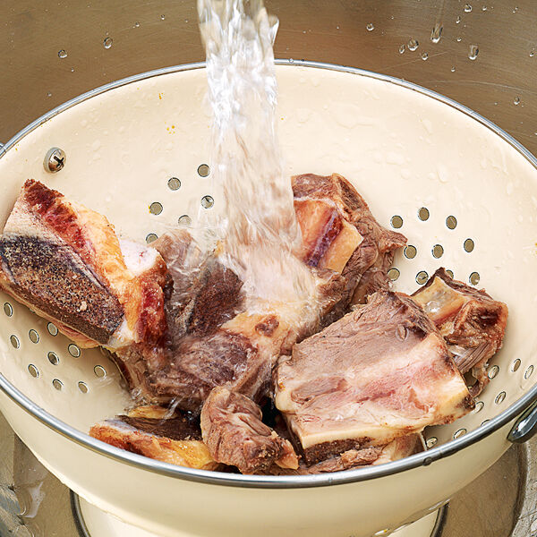 In einem großen Topf etwa 3 l Wasser aufkochen. Knochen hineingeben und kurz kochen lassen, dann alles in ein Sieb gießen. Knochen mit kaltem Wasser abspülen, um Blutreste zu entfernen. Knochen mit 4 l kaltem Wasser aufsetzen und aufkochen, dann etwa 3 Stunden bei geringer Hitze leise sieden lassen.