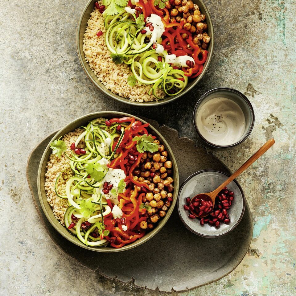 Die orientalische Bowl und der passende Dip aus Sojaghurt und Tahin dazu sind schnell gemacht und einfach lecker.