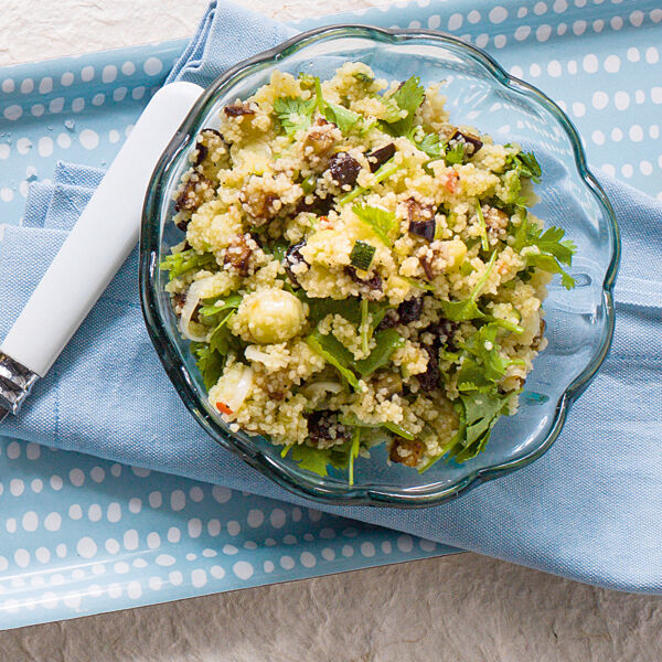 Den Couscous mit einer Gabel auflockern (so kann man ihn als Beilage zu Schmorgerichten und Ragouts servieren). Gemüse, Koriander und Rosinen mit Schale und Saft der Zitrone und dem restlichen Olivenöl unter den Couscous mischen. Mit Kreuzkümmel, Salz und Pfeffer abschmecken.