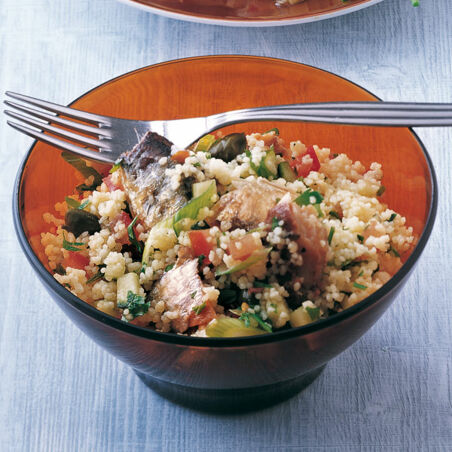 Dieser Couscous-Salat (auch "Taboulet") wird mit Sardinen zubereitet, was ihm eine herzhafte Note verleiht.