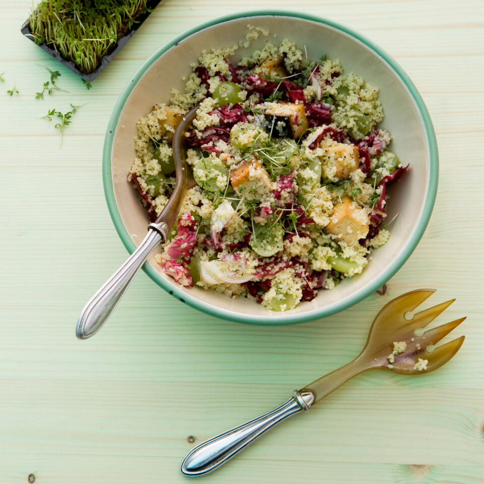 Den gequollenen Couscous etwas auflockern und mit den Weintrauben und dem Tofu zum Radicchio geben. Alles durchrühren und mit Salz und Pfeffer abschmecken. Die Kresse mit einer Schere abschneiden und darüberstreuen.