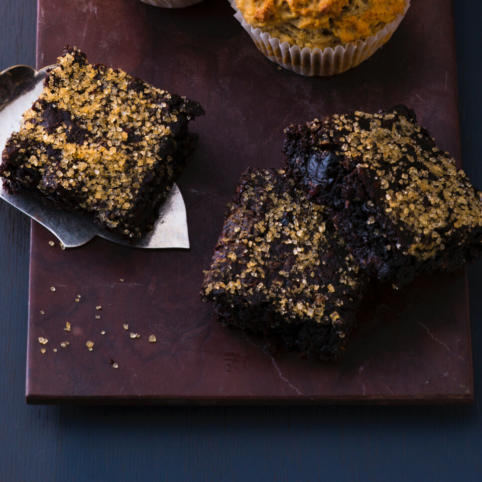 Den Teig in die Auflaufform füllen und glatt streichen. Mit 20 g Zucker bestreuen und im heißen Backofen (Mitte, Umuft 160°) 30-35 Min. backen. Die Brownies aus dem Ofen nehmen und etwas abkühlen lassen. Mit dem Papier aus der Form heben und auf einem Kuchengitter vollständig auskühlen lassen. In Stücke schneiden.