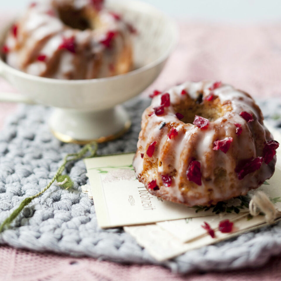 Die Aprikosenkonfitüre aufkochen, auf die Guglhupfe streichen und abkühlen lassen. Zuckerguss im heißen Wasserbad nach Packungsangabe erwärmen und auf die erkaltete Konfitüre streichen. Die restlichen Cranberrys fein hacken und die Gugl damit bestreuen.