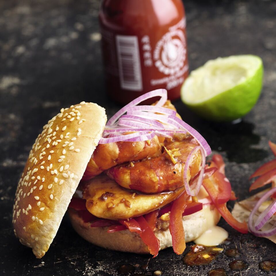 Dieser Burger nach Thailändischer Art überzeugt mit Garnelen- und Hähnchen-Toppings und würziger Sauce. Eine prima Alternative zu Cheeseburger und Co.