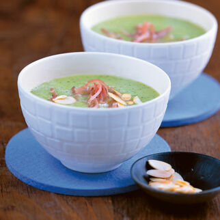 Die weißen Bohnen in der Brühe pürieren. Die übrigen Bohnen mit der Brühe vorsichtig zugießen. Alles aufkochen lassen, nochmals mit Salz und Pfeffer abschmecken. Die Suppe mit Mandelblättchen bestreut servieren.