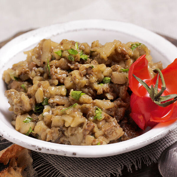 Die Petersilie waschen und trocken schütteln, die Blätter hacken. Die Auberginen sehr fein hacken oder mit dem Pürierstab mittelfein pürieren, mit Zitronensaft, Pfeffer, Salz und Petersilie würzen. Dazu schmecken Tomatenachtel und Fladenbrot.