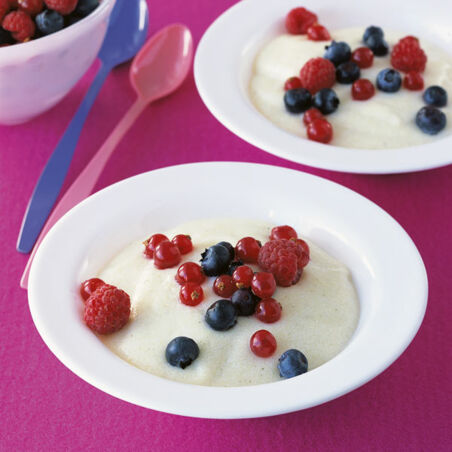 Den Grieß unter ständigem Rühren in die heiße Milch einrieseln lassen, einmal aufkochen, dann bei schwacher Hitze 5 Min. ausquellen lassen. Grießbrei auf tiefe Teller verteilen, Beeren darauf geben.