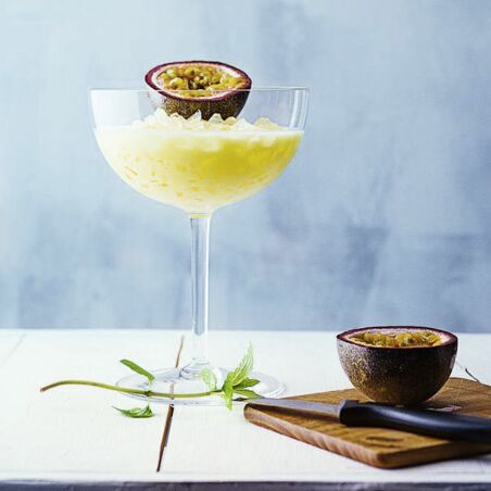 Die Maracujahälfte auf das Eis legen, den Cocktail mit der Minze dekorieren und sofort mit dem Trinkhalm servieren.