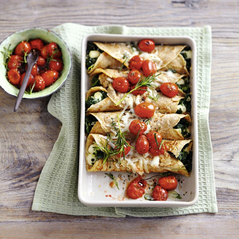 Eine Auflaufform mit Olivenöl einfetten. Die Spinatfüllung auf den Crespelle verteilen, Crespelle aufrollen und in die Form legen. Mit Olivenöl beträufeln, mit dem übrigem Pecorino bestreuen und im Ofen (Mitte, Umluft 180°) 15-20 Min. überbacken.