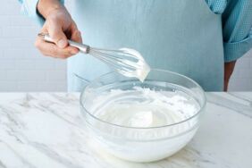 In einer mittelgroßen Schüssel die Eier mit dem Zucker, dem Vanille-Extrakt und dem Salz gründlich verquirlen. Sahne und Milch unterrühren.