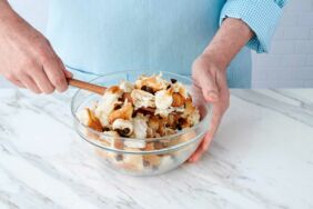 Die Croissantmischung mit der Sahne-Eier-Milch übergießen. Mit einem Teigschaber alles behutsam vermengen. Die Mischung gleichmäßig in der vorbereiteten Grillplatte oder Pfanne verteilen.