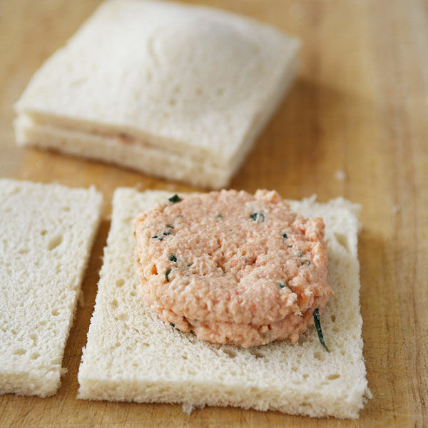 Je 2 EL der Taschenkrebsmasse in die Mitte einer Toastbrotscheibe geben, mit einer zweiten Scheibe Toast bedecken und an den Kanten fest zusammendrücken. Den Backofen auf 180° vorheizen.