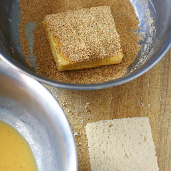 Die geschlossenen Toasts erst in Mehl, dann in den verquirlten Eiern und schließlich im Paniermehl wenden. Die Panade gut andrücken und ein weiteres Mal panieren.