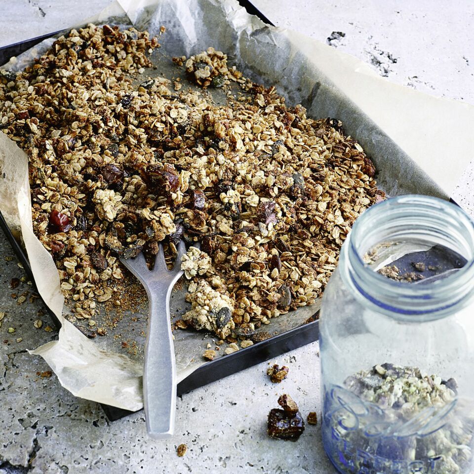 Inzwischen die Datteln fein hacken. Nach 20 Min. Backzeit das Backblech kurz herausnehmen, Datteln zur Granolamasse geben, untermengen und erneut festdrücken. Alles zu Ende backen, bis es knusprig und golden gebräunt ist. Abgekühlt in Stücke brechen, luftdicht verpacken und innerhalb von 4 Wochen verbrauchen.