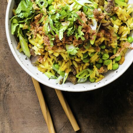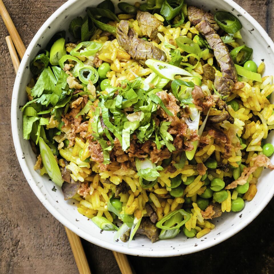 Würziger chinesischer Bratreis mit indischem Currypulver und knusprigen amerikanischen Röstzwiebeln - mehr Fusion geht nicht!