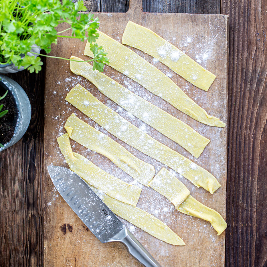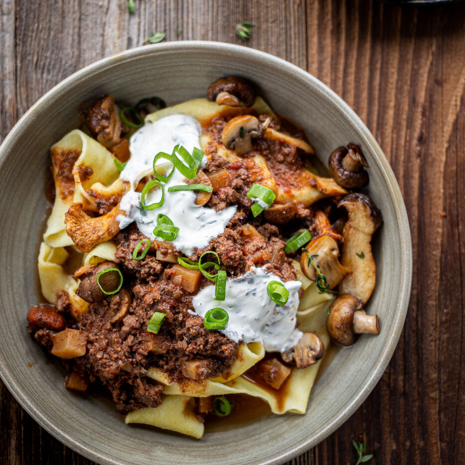 Mit Mecklenburger Ananas, selbstgemachten Papardelle, Pilzauswahl und Kräuter-Sauerrahm