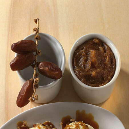Die Datteln und die Walnüsse mit 1 EL Zitronensaft, der Zitronenschale, 2 EL Honig, 4 EL Wasser, den Gewürzen und dem Orangenlikör in ein Püriergefäß füllen und fein pürieren. Die feste Masse nach Belieben mit Wasser und etwas Honig verdünnen.