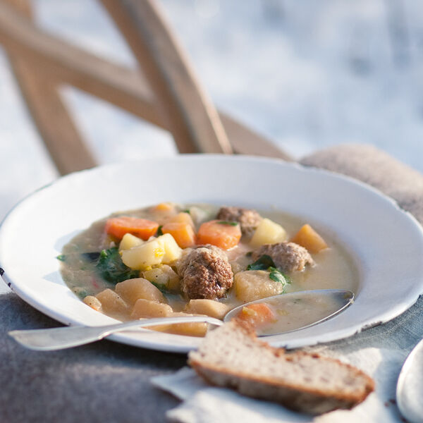 Vom Eintopf 1 Schöpfkelle abnehmen und mit einem Stabmixer pürieren. Das Püree mit Sahne, Spinat und Majoran unter den Eintopf rühren und ca. 5 Min. mitkochen lassen. Mit Salz, Pfeffer und Muskat abschmecken.