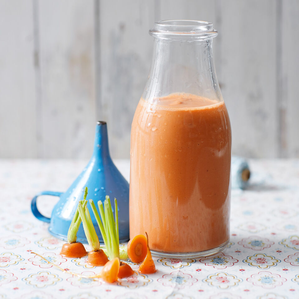 Die Möhren gründlich waschen, putzen und grob zerkleinern. Die Banane schälen und ebenfalls in grobe Stücke schneiden. Möhren und Banane in den Mixer geben.