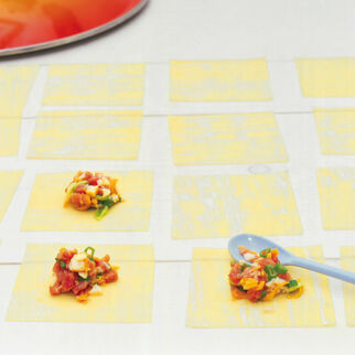 Den Teig nochmals durchkneten und kleine Stücke – wieder walnussgroß – abnehmen. Jeweils auf der Arbeitsfläche auf wenig Mehl dünn und rund ausrollen. In der Mitte mit der Füllung belegen und den Teig darüber zusammenfassen und leicht verdrehen. Die Teigtäschchen auf der Arbeitsfläche liegen lassen und mit einem Küchentuch abdecken.