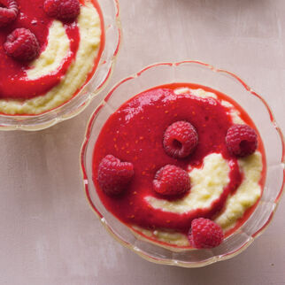 Pudding nochmals verrühren und Sahne unterheben. Schokoraspel einrühren oder zum Schluss auf das Dessert streuen. Mit Beeren garnieren.