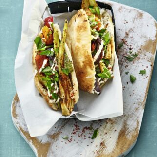 Zwiebeln schälen und in dünne Ringe hobeln. Fladenbrot vierteln und waagrecht ein-, aber nicht durchschneiden. Brotviertel nacheinander auf einem Toaster rösten, in einem sauberen Geschirrtuch warm halten.