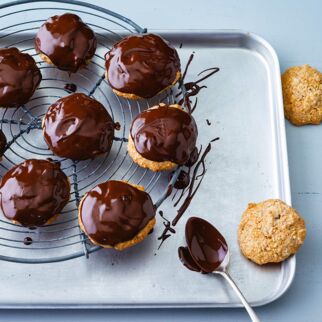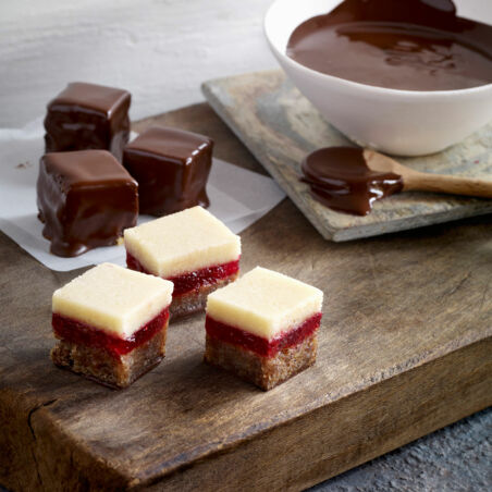 Kuvertüre hacken, schmelzen, temperieren. Platte und Backmatte entfernen, Lebkuchen mit Kuvertüre bestreichen, fest werden lassen, wenden, auf Backpapier setzen. In ca. 3 cm große Würfel schneiden, in die Kuvertüre tauchen, auf Backpapier fest werden lassen.