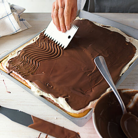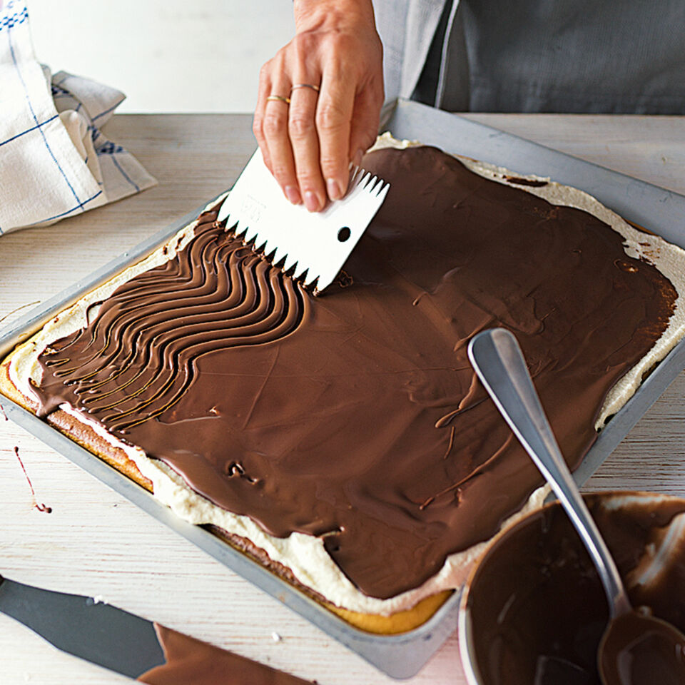 Für den Belag die Butter schaumig rühren und die abgekühlte Puddingmasse nach und nach dazugeben. Den abgekühlten Teig mit der Creme bestreichen. Für den Guss die Glasur klein hacken, die Sahne erhitzen und die Glasur darin auflösen. Den Kuchen mit dem Schokoguss überziehen, dabei nach Belieben mit einem Garnierkamm Wellen ziehen. Dann nochmals ca. 1 Std. kühl stellen. Zum Servieren in quadratische Stücke schneiden.