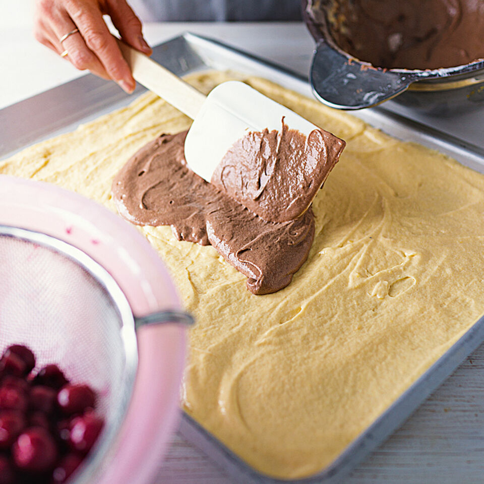 Inzwischen für den Teig den Ofen auf 170° vorheizen, das Blech mit Backpapier auslegen. Die Kirschen in einem Sieb abtropfen lassen. Aus den restlichen Teigzutaten (außer dem Kakao) nach dem Grundrezept (siehe Rezept-Tipp) einen Rührteig zubereiten. Die Hälfte des Teiges gleichmäßig auf dem Backblech verteilen.