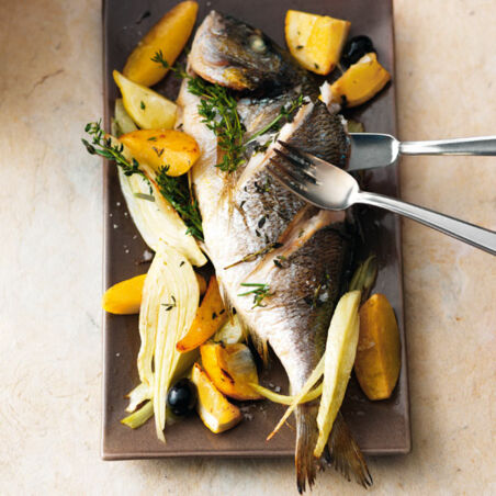 Nach 15-20 Min. Garzeit Fenchel unter die Kartoffeln mischen, die Dorade darauflegen. Wermut angießen und alles im Ofen weitere 15 Min. garen (zwischendurch eventuell etwas Wasser dazugießen). Die Zitronenhälfte waschen, in Stückchen schneiden und mit den kleinen Kräuterzweigen und den Oliven zwischen Kartoffeln und Fenchel verteilen. Die Dorade vorsichtig umdrehen und alles noch 10-15 Min. garen. Fisch in der Form mit knusprigem Baguette servieren.