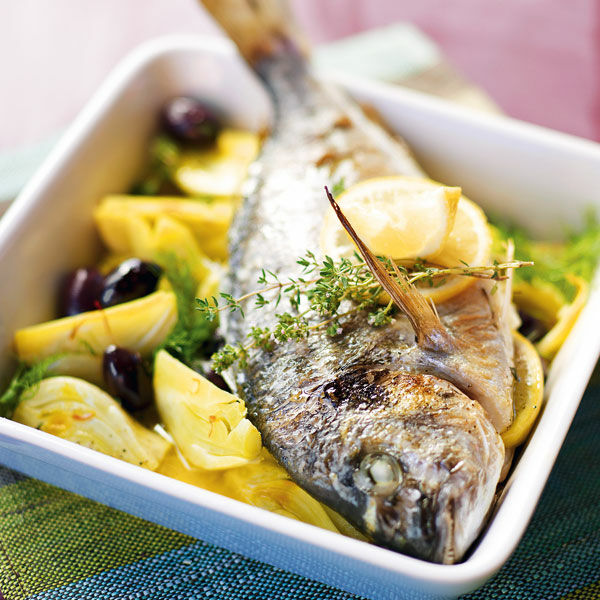 Die Fische beidseitig mit restlichem Öl bepinseln, salzen und pfeffern. Fenchel aus dem Ofen nehmen, die Oliven unterrühren, die Fische darauflegen und dann alles im Ofen weitere 20-25 Min. garen. Wer will, schaltet ca. 5 Min. vor Garzeitende noch den Grill zu, damit die Fische noch leicht bräunen. Am besten in der Form servieren und ofenfrisches Baguette oder Couscous dazu reichen.