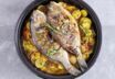 Schalotten, Kartoffeln, Paprika, Tomaten, Rosmarin und Thymian in der Tajine 2-3 Min. andünsten. Mit Salz, Pfeffer und übrigem Paprikapulver würzen. 200 ml Wasser dazugießen, das Gemüse mischen und die Fische daraufsetzen. Den Deckel auflegen, die Dampfsperre mit kaltem Wasser füllen und die Tajine im Ofen (unten) ca. 30 Min. garen. Danach den Deckel abnehmen und die Fische offen im Ofen noch ca. 10 Min. garen. Die Fische aus dem Ofen nehmen und mit dem Gemüse servieren.
