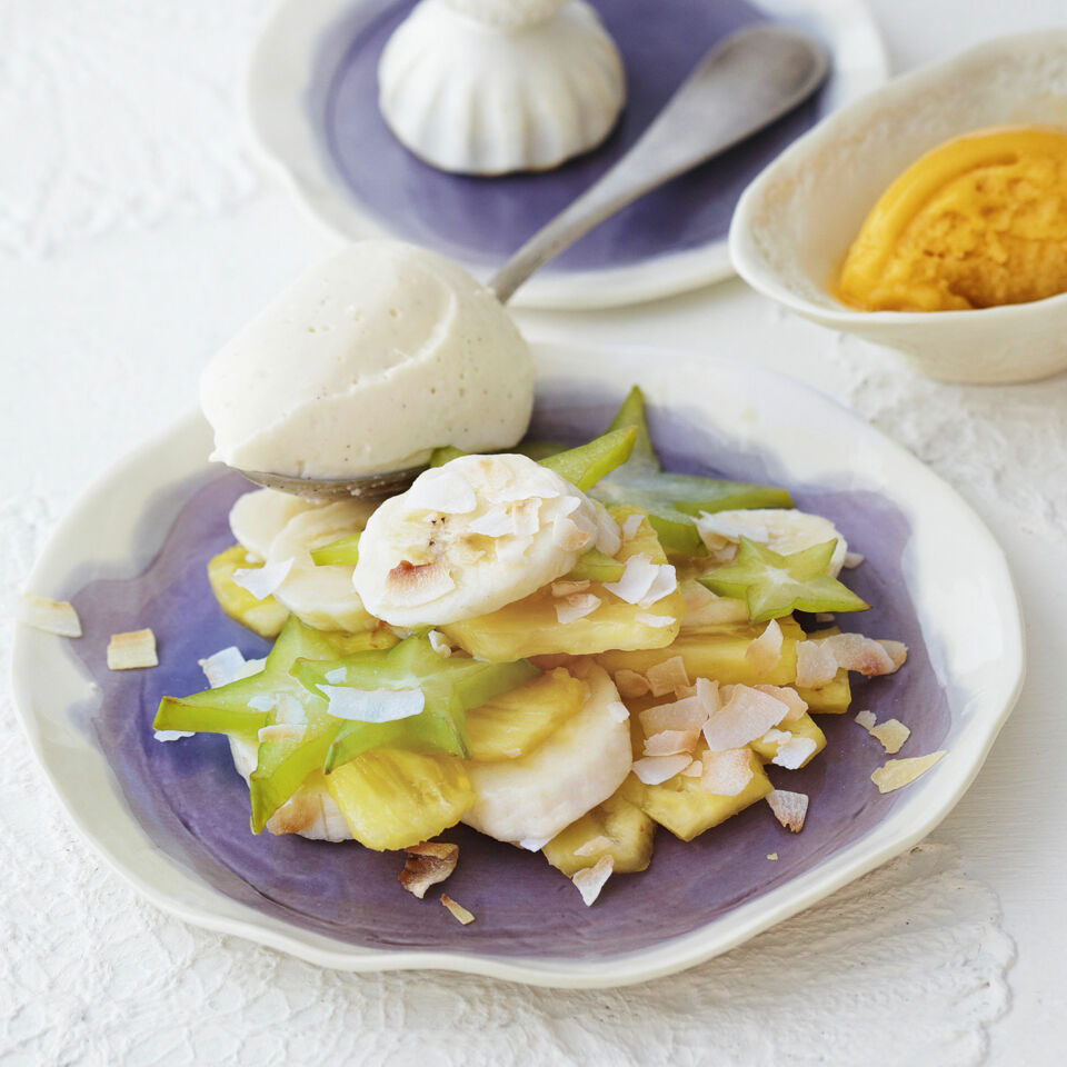 Bananen schälen und in Scheiben schneiden. Sternfrucht waschen und in Scheiben schneiden. Die Limette heiß waschen und trocken reiben, die Schale abreiben und den Saft auspressen. 2 EL Limettensaft, Wein, Limettenschale und Honig verrühren. Ananas, Banane, Sternfrucht und Kokoschips dazugeben und kurz marinieren.