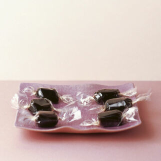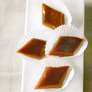 Die Karamellmasse auf das Blech streichen und kalt werden lassen. Den Karamell auf eine glatte Fläche stürzen und in ca. 30 Würfel oder Rauten schneiden.