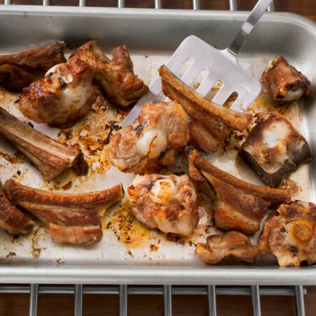 Den Backofen auf 220° (Umluft 200°) vorheizen. Die Knochen im Backofen in 30 Min. rösten.