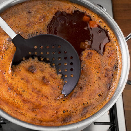 Mit Rotwein ablöschen. Restlichen Rotwein und ca. 2,2 l Wasser dazugießen, kräftig salzen und alles aufkochen. Evtl. auftretenden Schaum abschöpfen. Die Sauce offen bei kleiner Hitze ca. 1 Std. köcheln.