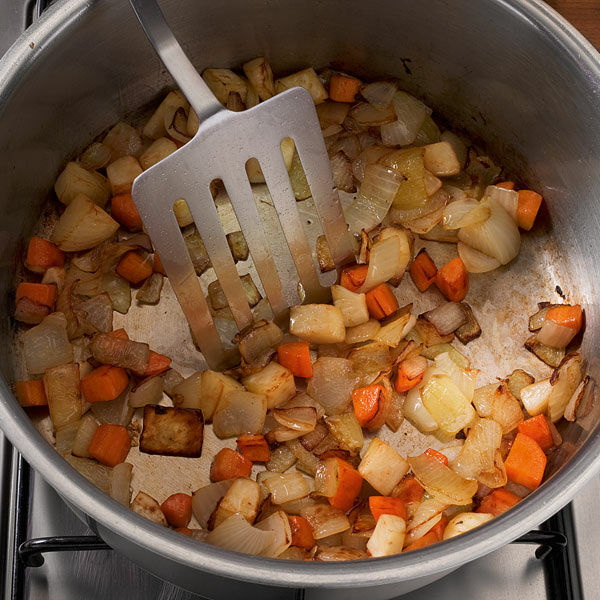 Das Olivenöl in einem Topf (28 cm Ø) erhitzen. Zwiebeln darin bei mittlerer Hitze ca. 3 Min. rösten, Möhren und Sellerie weitere 5 Min. mitrösten. Knochen zum Gemüse geben. Tomatenmark einrühren und 5 Min. unter ständigem Rühren rösten.