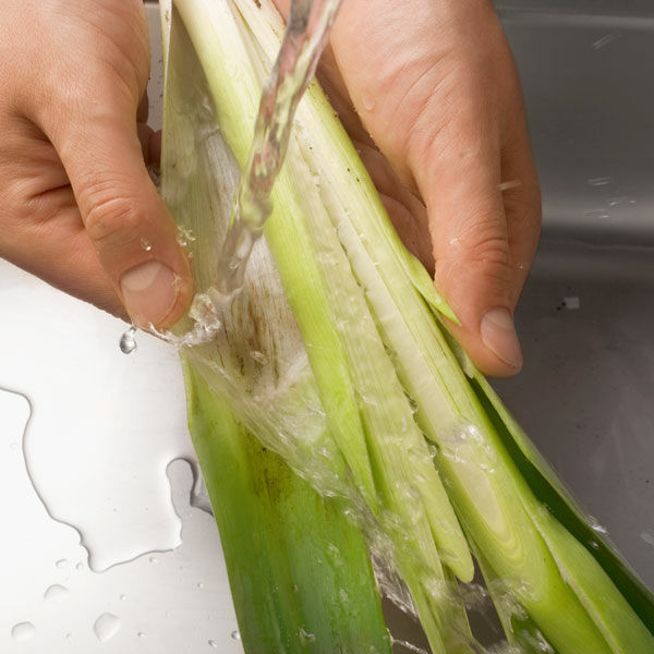 Lauch putzen, längs einschneiden, waschen und in grobe Stücke schneiden. Knoblauch schälen und halbieren. Thymian und Salbei waschen und trocken schütteln. Lauch, Knoblauch, Thymian, Salbei, Lorbeerblätter, Pfeffer- und Pimentkörner zum Fond geben und diesen offen weitere 1 Std. 30 Min. köcheln.