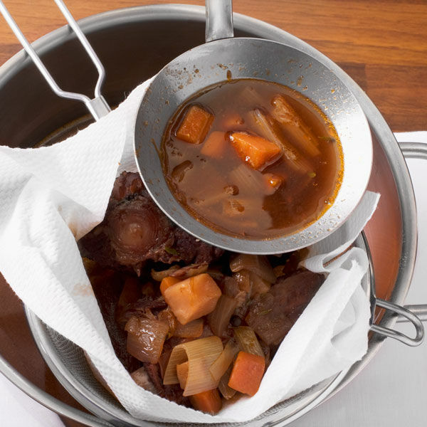 Den Fond durchpassieren und gleich weiterverarbeiten. Oder auskühlen lassen, portionsweise einmachen oder einfrieren.