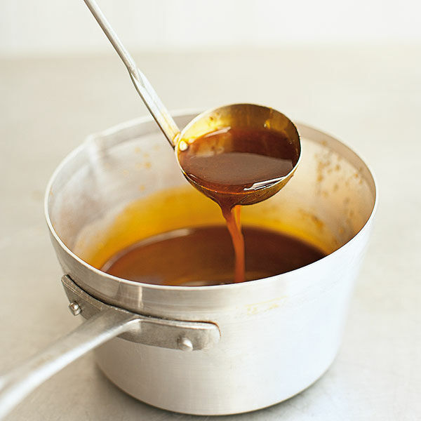 2 l heißes Wasser angießen und den Bratensatz lösen. Bei milder Hitze mindestens 2½ Std. kochen lassen, davon 1 Std. offen. Schaum zwischendurch abschöpfen. Fond durch ein feines Sieb gießen, abkühlen lassen und das Fett abheben.