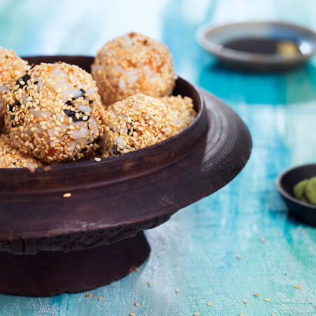 „Onigiri“ heißen diese Bällchen, die man sich in Japan selbst rollt mit allem dran und drin, was zu Sushi gehört: Reis, Ingwer, feiner Fisch, Algen und Sesam.