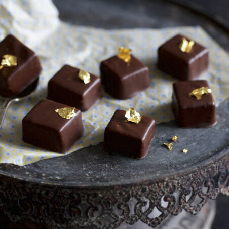 Den Rahmen mit einem Messer von der Ganache lösen und vorsichtig entfernen. Die Ganache in ca. 50 Würfel schneiden. Zum Überziehen die restliche Kuvertüre hacken, schmelzen und auf 31 - 32° temperieren. Die Pralinen einzeln in die Kuvertüre tauchen und auf Backpapier absetzen. Mit je 1 Stückchen Blattgold verzieren und mind. 2 Std. fest werden lassen.