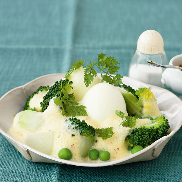 Salzwasser in einem Topf aufkochen. Den Brokkoli waschen, putzen und in Röschen teilen. Den Kohlrabi schälen, achteln und in ca. 12 Min. im Salzwasser garen. In den letzten 3 Min. Brokkoli und Erbsen mitgaren. Die Eier in ca. 3 ½ Min. wachsweich kochen. Inzwischen den Kerbel waschen, trocken schütteln und hacken. Das Gemüse abgießen und warm halten.