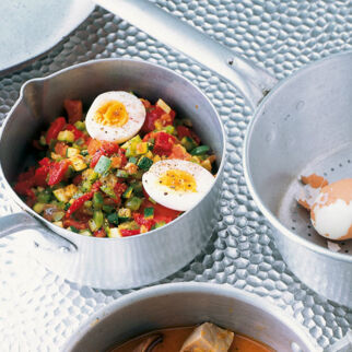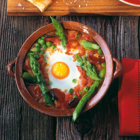 Den Ofen auf 180° vorheizen. Die cazuelitas leicht einölen und den sofrito hineingeben. Spargelstücke und Erbsen darauf geben. Die chorizo in Scheiben schneiden und darauf verteilen. Mit einem Esslöffel jeweils eine Vertiefung in die Oberfläche drücken und je 1 Ei vorsichtig hineinschlagen, ohne das Eigelb zu verletzen. Im heißen Ofen (Mitte, Umluft 160°) 10-12 Min. überbacken, bis die Eier gestockt sind. Mit Weißbrot servieren.