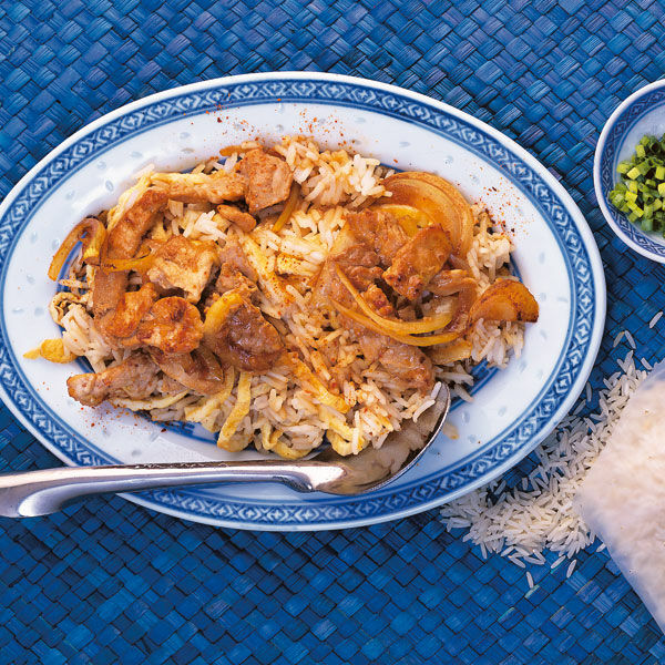1 EL Öl in einer Pfanne erhitzen, Eier hineingießen, bei mittlerer Hitze 1-2 Min. stocken lassen, wenden und in 1-2 Min. fertig braten. Omelett aufrollen, in Röllchen schneiden. 1 EL Öl erhitzen, Knoblauch und Fleisch darin bei mittlerer Hitze unter Rühren 3 Min. braten. Zwiebeln dazugeben und 2 Min. mitbraten. Reis, Sojasauce und Limettensaft untermischen und noch 4 Min. garen, evtl. etwas Brühe dazugeben. Abschmecken und Omelettröllchen untermischen.