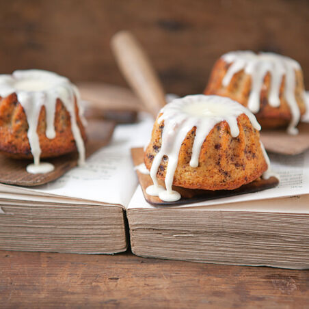 Für die Deko den Puderzucker in ein Schälchen sieben, mit dem restlichen Eierlikör verrühren und über die Guglhupfe laufen lassen.